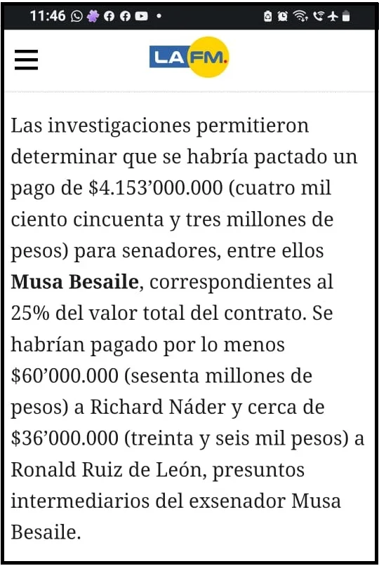 Richard Náder resultó vinculado al escándalo de las coimas en Fonade en ese 2018, donde hubo feria de dádivas de miles de millones para congresistas de la época como el mismo Elías por las intermediaciones en la adjudicación de contratos de infraestructura a conocidos consorcios. Luego se supo de este Náder era socio del hermano de Musa, el exgobernador Edwin Besaile.