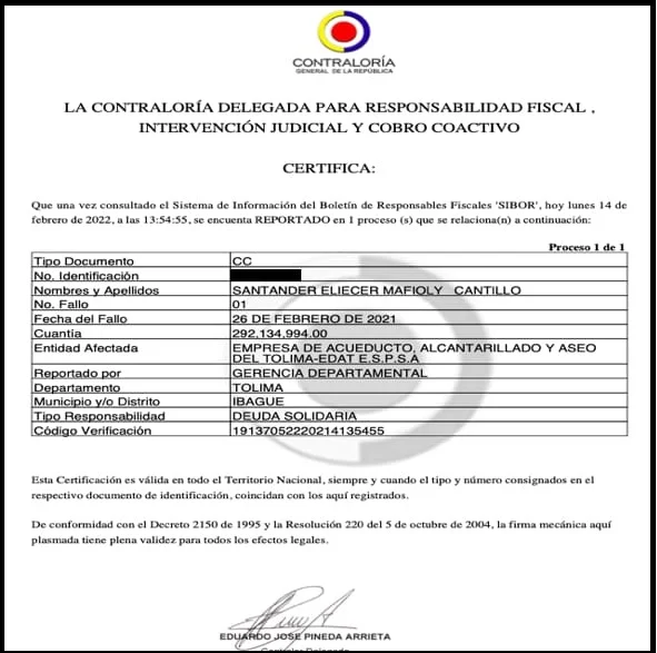 El ingeniero Santander Eliécer Mafioly Cantillo es accionista de Consicivil SAS, la mayor socia del Consorcio Rivera Tierralta, que firmó un contrato para la recuperación de la ronda del Río Sinú en diciembre de 2021. Fue sancionado por la Contraloría en febrero de 2021 por un detrimento fiscal a la EPS Acueducto y Alcantarillado del Tolima por 292 millones de pesos.