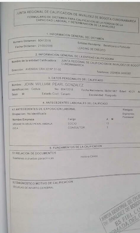 Documento radicado en el Juzgado de Funza, en la demanda de divorcio con María Castellanos, por los mismos abogado de Jhon William Pearl en el cual sostienen que el está discapacitado y no puede pagar alimentos. Curiosamente a la entidad a la cual se le remite es el Banco Itaú. ¿Cómo pudo Pearl crear y firmar esa madeja de empresas internacionales siendo discapacitado?
