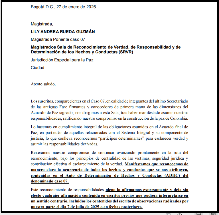 La carta, enviada a la Sala de Reconocimiento de la Verdad de la JEP, fue firmada por Rodrigo Londoño Echeverry, conocido como Timochenko; Pastor Alape Lascarro, Milton de Jesús Toncel, Jaime Alberto Parra Rodríguez; y Pablo Catatumbo Torres y Julián Gallo Cubillos (actuales senadores del partido Comunes).