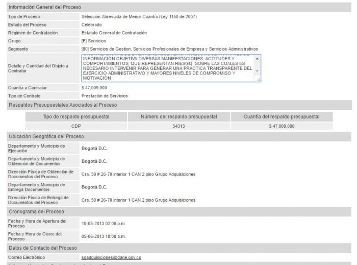 Con el DANE firmó un contrato de $47 millones en junio del 2013, que se lo dio el entonces titular de esa entidad Jorge Bustamante, un mes antes de dejar el cargo. El objeto fue crear una práctica transparente en el ejercicio administrativo y mayores niveles de compromiso y motivación por parte de los empleados.