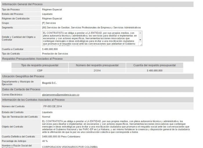 Luego, por ese respaldo, recibió un contrato por $480 millones con la Presidencia, mediante la Oficina del Alto comisionado para la Paz, Sergio Jaramillo, para estimular la movilización ciudadana. En otras palabras, el negocio fue para respaldar la deslucida Marcha por la Paz que organizó el Mandatario Santos, buscando que los colombianos apoyaran su acuerdo con las Farc.