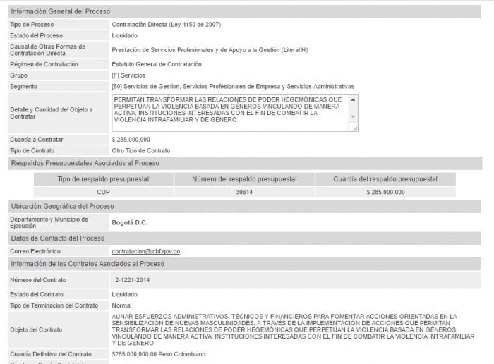Con el Instituto de Bienestar Familiar (ICBF), que manejaba Cristina Plazas, firmó un convenio en noviembre de 2014, por $285 millones para “aunar esfuerzos para orientar en la sensibilización de nuevas masculinidades a través de la implementación de acciones que permitan transformar las relaciones de poder hegemónicas que perpetúan la violencia basada en géneros…”.