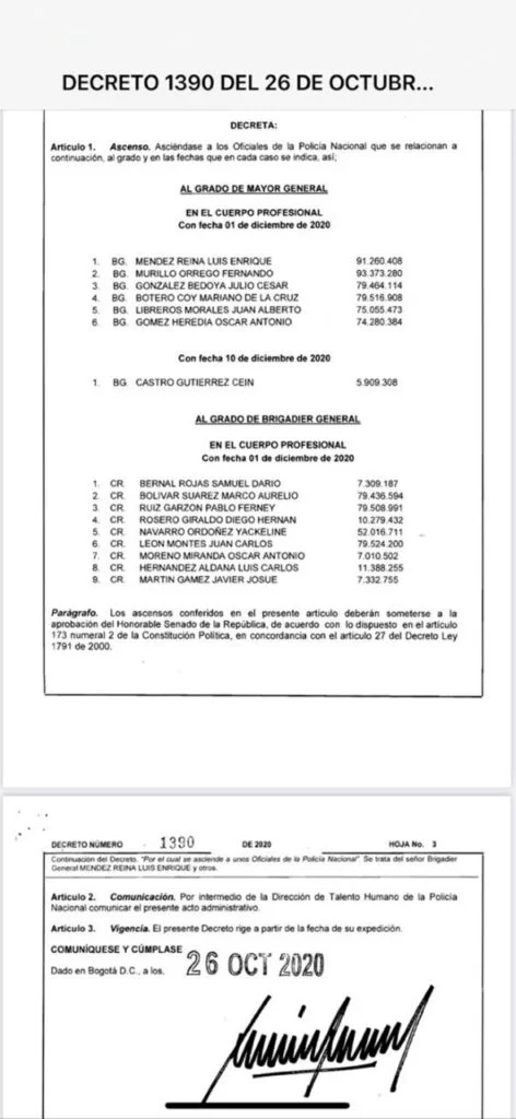 De los 46 ascensos a Generales de oficiales de las diferentes fuerzas militares, fueron promovidos 16 miembros de la Policía Nacional, cuyas hojas de vida, pasaron a consideración del Senado de la República, organismo que al comprobar que cumplían con los requisitos consagrados en la Constitución Nacional, la ley y las normas vigentes, las aprobó. Surtido el presente prerrequisito, fueron promovidos por decreto 1390, del 26 de octubre/2020, del Gobierno Nacional los siguientes oficiales de la Policía Nacional: