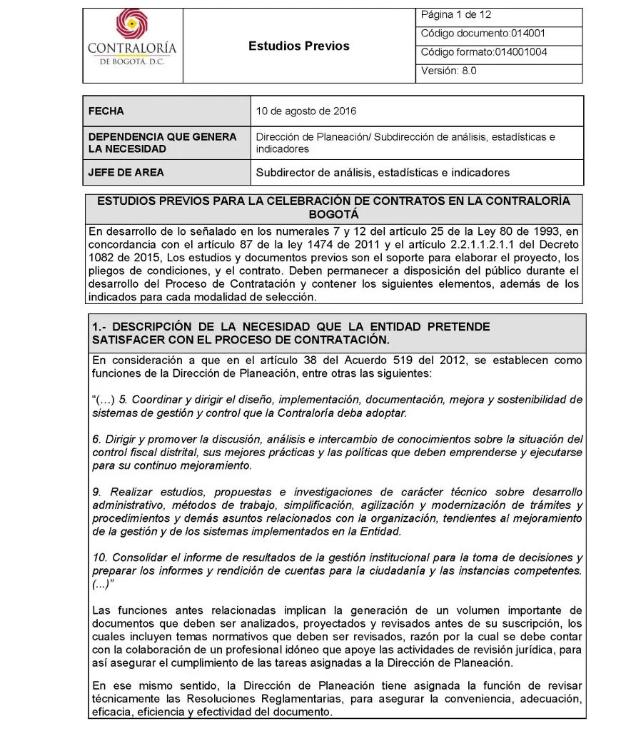 En la Contraloría de Bogotá, Giraldo Polanía, quien ocupa el cargo de Subdirector de Análisis Estadísticas e Indicadores, es el que generó las necesidades plasmadas en los Estudios Previos para que fuera contratada su amiga y jefa Jaramillo Mutis. Además, cumple la función de supervisión de los negocios de la expareja de Varón Cotrino.