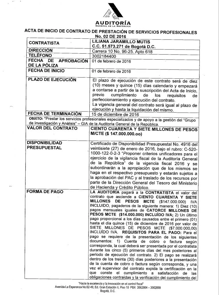 | 02 de 2016 | Prestar los servicios profesionales especializados y de asesoramiento y apoyo a la gestión del “Grupo e Investigación y Análisis” – GIA de la Auditoría General de la República | 147 millones | 29-01-2016 | 300 |