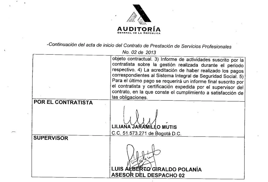 Los contratos de Jaramillo en la Auditoría contaron con una particularidad: Luis Alberto Giraldo Polanía ejerció la Supervisón las actividades realizadas por su ex jefa.