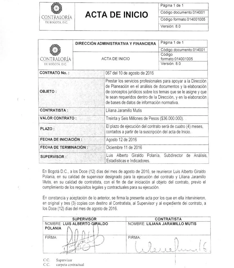 Con esta acta de inicio (Ver abajo) el contratista, o sea la Contraloría Distrital, da el visto bueno para que Jaramillo inicie la labor contratada. El engargado de ese aval es nada menos que el supervisor Luis Alberto Giraldo, Subdirector de Análisis Estadísticas e Indicadores, el gran amigo y antiguo subalterno de Jaramillo, con lo cual le pagó algunos de los favores que esta mujer hizo por él en el pasado, como llevandóselo a trabajar con ella a todos lados. Un típico caso de yo te ayudo, tú me ayudas. Una clara malversación de los dineros del Estado…Un caso de corrupción.