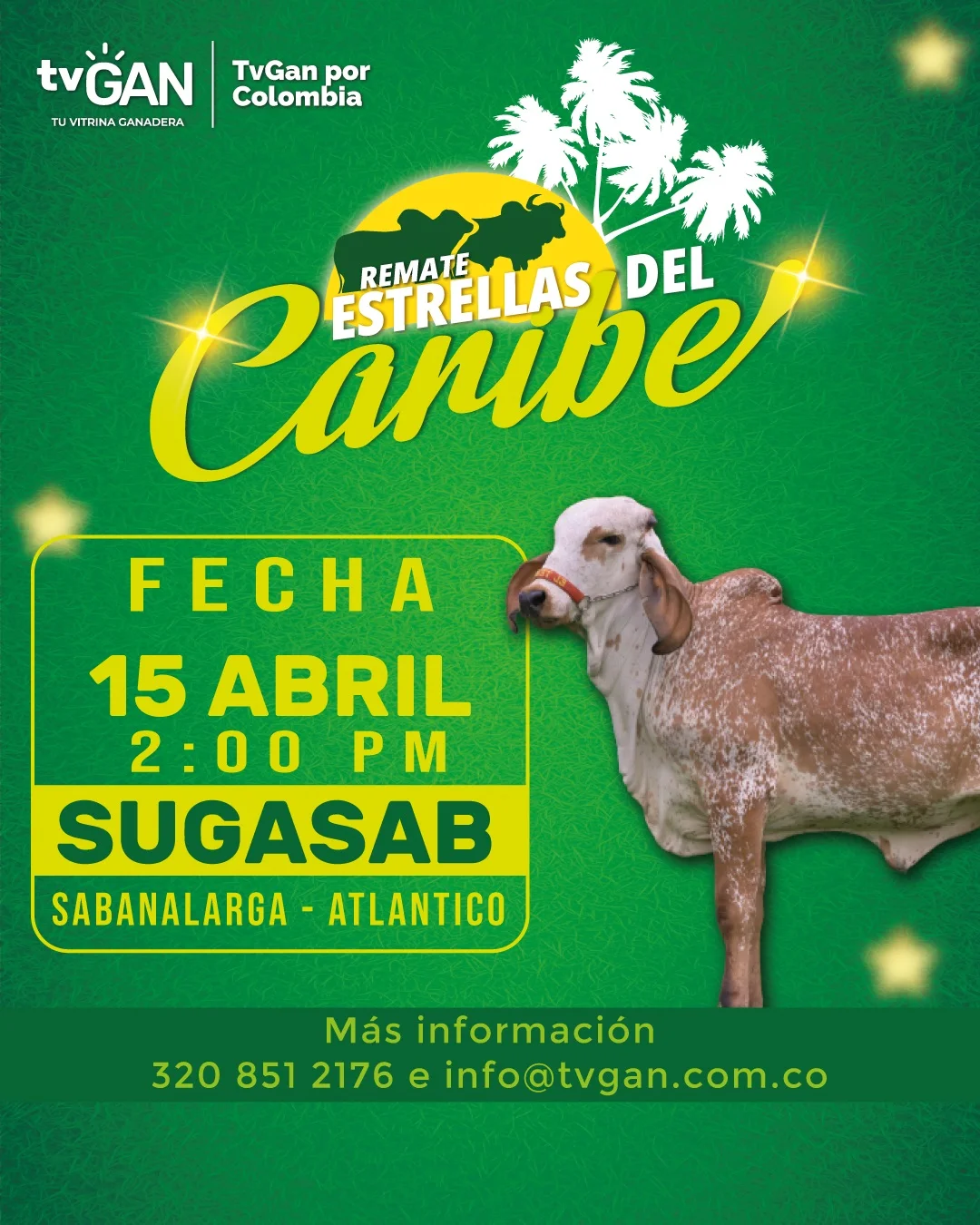 TVGAN por Colombia llevará a cabo este sábado 15 de abril el remate de ganado Estrellas del Caribe en Sabanalarga (Atlántico). En esta ocasión los martillos serán Luis Ayazo y Spencer Pardo. Es una oportunidad para que ganaderos de todo el país amplíen y mejoren sus hatos.